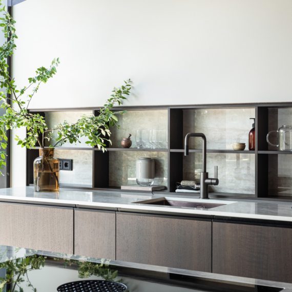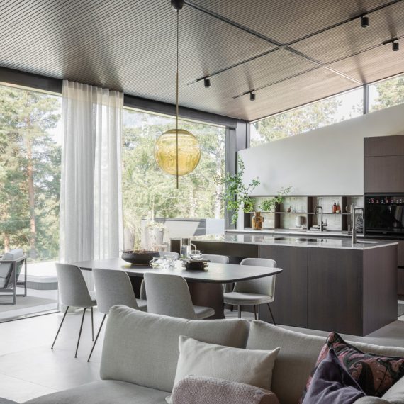 Aurinkolinna on sisustukseltaan ylellinen, selkeälinjainen ja ajaton. Jokainen materiaali, sävy ja yksityiskohta on tarkkaan harkittu ja sama yhtenäinen tunnelma kantaa läpi talon. Keittiö ja oleskelutilat jatkuvat 12-metrisen lasiseinän ansiosta saumattomasti suurelle terassille, jonka katettu kesäkeittiö on lämmitettävissä vaikka aurinkoenergialla. Hulppean saunaosaston kruunaa valtava kulmaikkuna, josta avautuva metsämaisema puiden latvojen lomitse on vaikuttava.